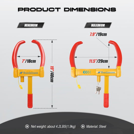Ruedamann Universal Wheel Lock, Heavy Duty Trailer Wheel Lock, Anti Theft Tire Lock for Cars, Trucks, ATVs, Motorcycles, Anti Car Theft Lock for Trailers, Golf Cart, (Red-Yellow, 3 Keys)