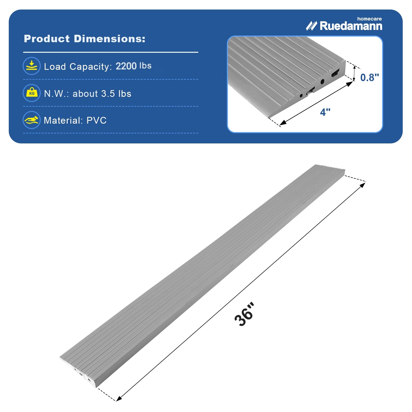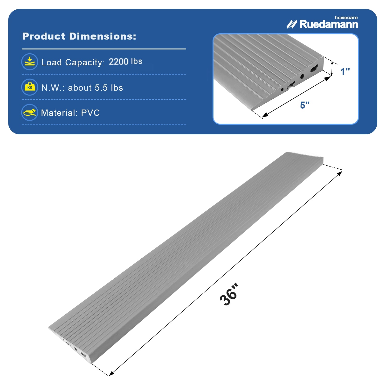 【Size and Capacity】Ruedamann PVC Threshold Ramp supports up to 2200 lbs, delivering strong performance and long-lasting durability.