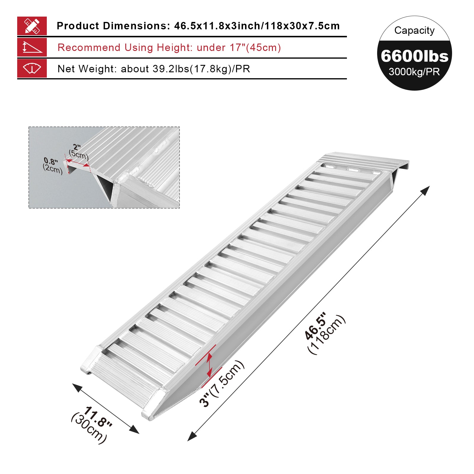 【Dimension】Each ramp measures 46.5" x 11.8" x 3". This compact design makes the ramp easy to use, move, and store, saving space. The recommended usage height is up to 17.7".