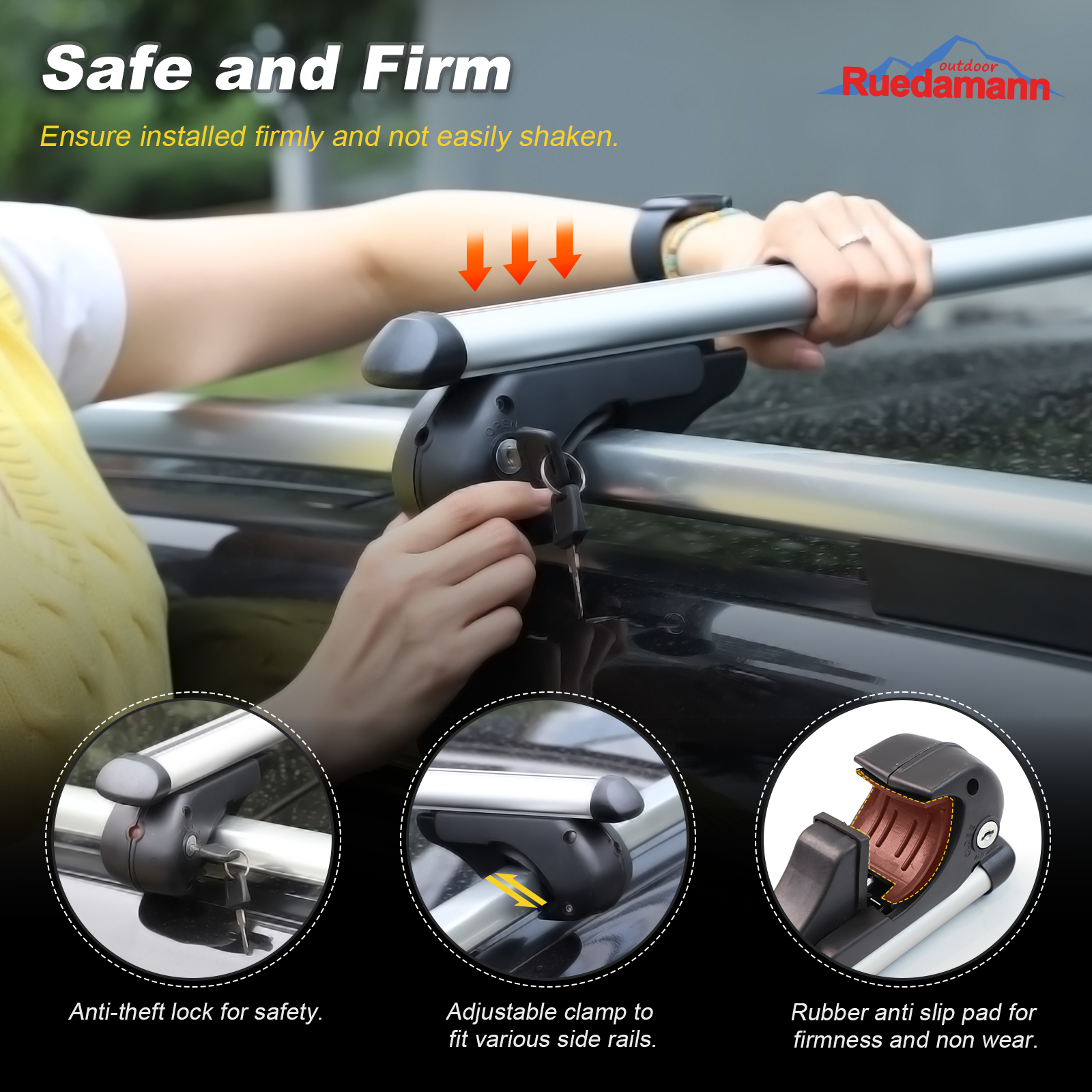 【Secure & Long-Lasting】Ruedamann roof rack cross bars come with locks on both sides to prevent theft. Rubber clamps hold the roof rails securely without scratching. Designed to support loads up to 165 lbs, these cross bars maintain their shape and provide reliable, long-term use.