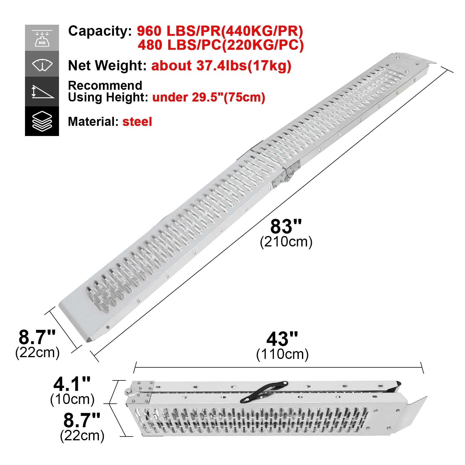 【Safe Loading and Unloading】Our bike ramps for trucks are designed to provide strong and reliable support for your equipment. Each ramp has a capacity of 480 lbs and can support 960 lbs when used in pairs. Constructed from galvanized steel, they provide a stable base for loading and unloading vehicles under 29.5" in height.