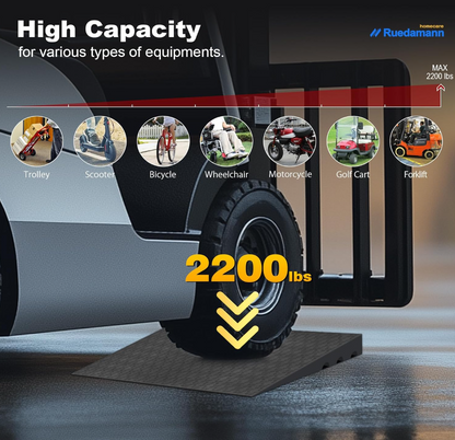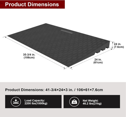 • [Specifications & Loading Capacity] 3" (H) x 24" (L) x 41.7" (W), can hold up to 2200 lbs. This wheelchair threshold ramp enables an easy transition for doorways and ensures safe and smooth going up and down any entryway. It is designed for scooters, two-wheelers, four-wheelers, manual wheelchairs, power chairs, walkers, etc. Suitable for various indoor and outdoor application such as any doorways, entryways, driveways, curbs, steps, stores, garages, sheds, barns, curves.