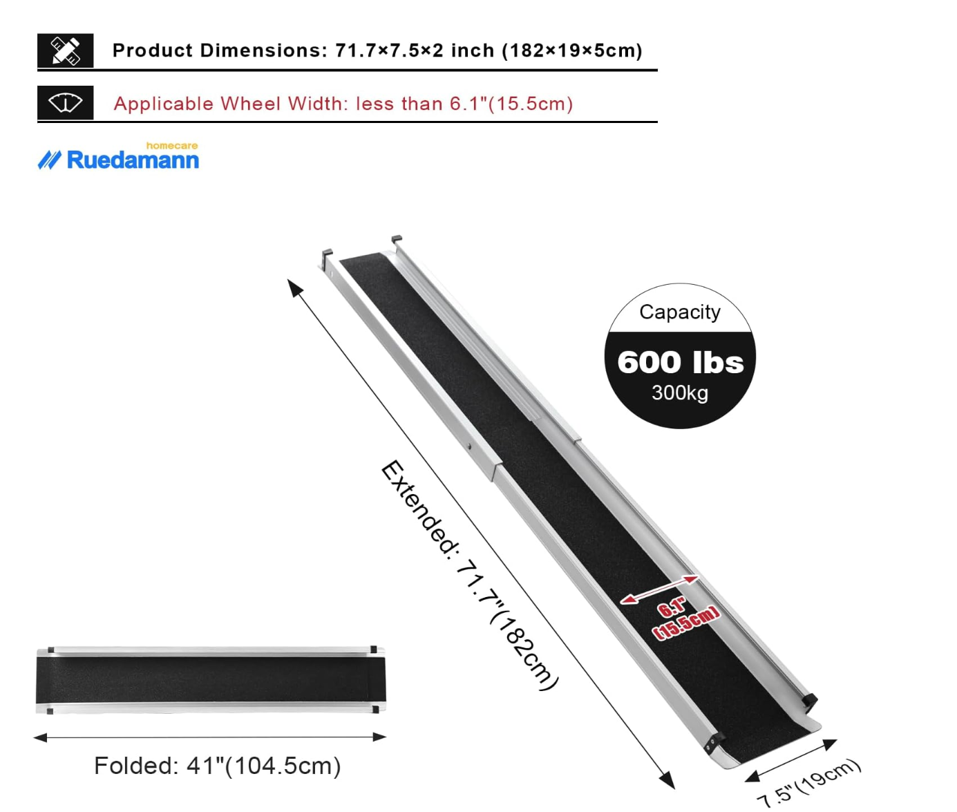 【6FT Telescoping Wheelchair Ramp】This portable wheelchair ramp is adjustable, extending from 41" to 72" to accommodate various steps. Its telescoping, retractable design makes it easy to store and transport, ideal for wheelchair ramps for home or temporary wheelchair ramps for steps. The ramp is 7.5" wide and supports up to 600lbs, suitable for steps up to 18" in height