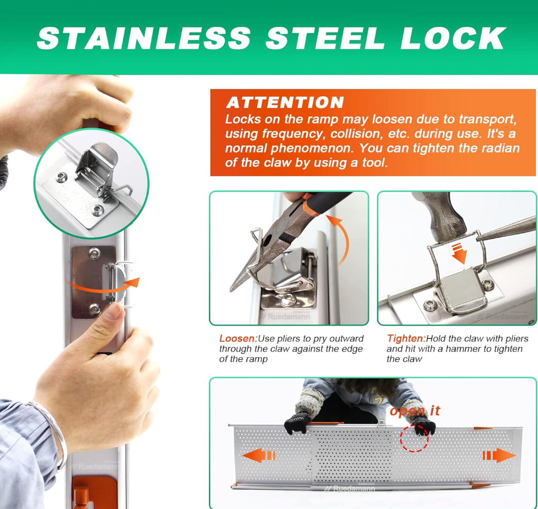 【Flexible Length】Our wheelchair ramp features a robust stainless steel lock buckle to easily adjust the desired length, the side bezel is 2 inches high, making it wheelchair accessible(Before purchase,Please note the thickness of your tires)