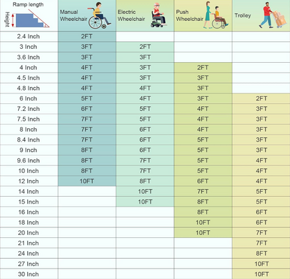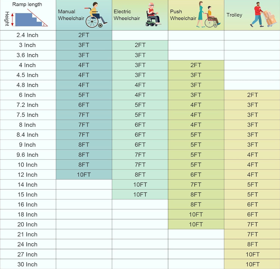 For manual wheelchairs, our recommended slope ratio is 1:6. For example, for a 1 cm rise (vertical height) you will need a 6cm long ramp. If you have a larger space for the ramp, you can buy a longer ramp than recommended as this means you will have less effort and easier going up and down the steps. Note: 1:4 is the maximum height.