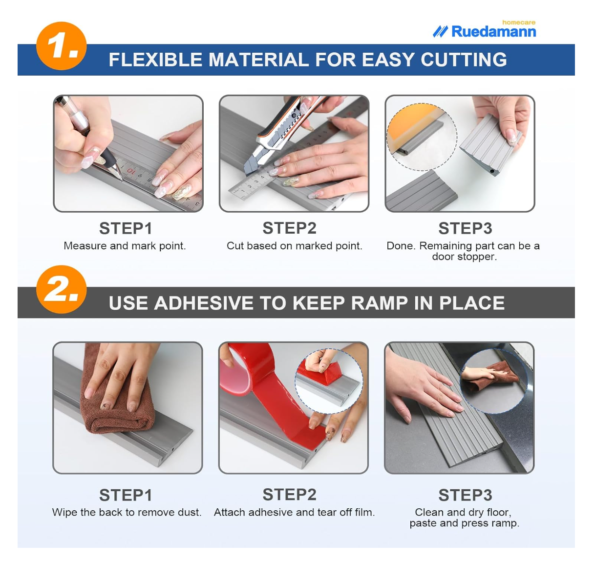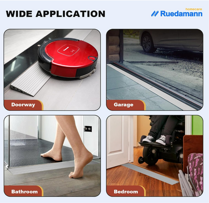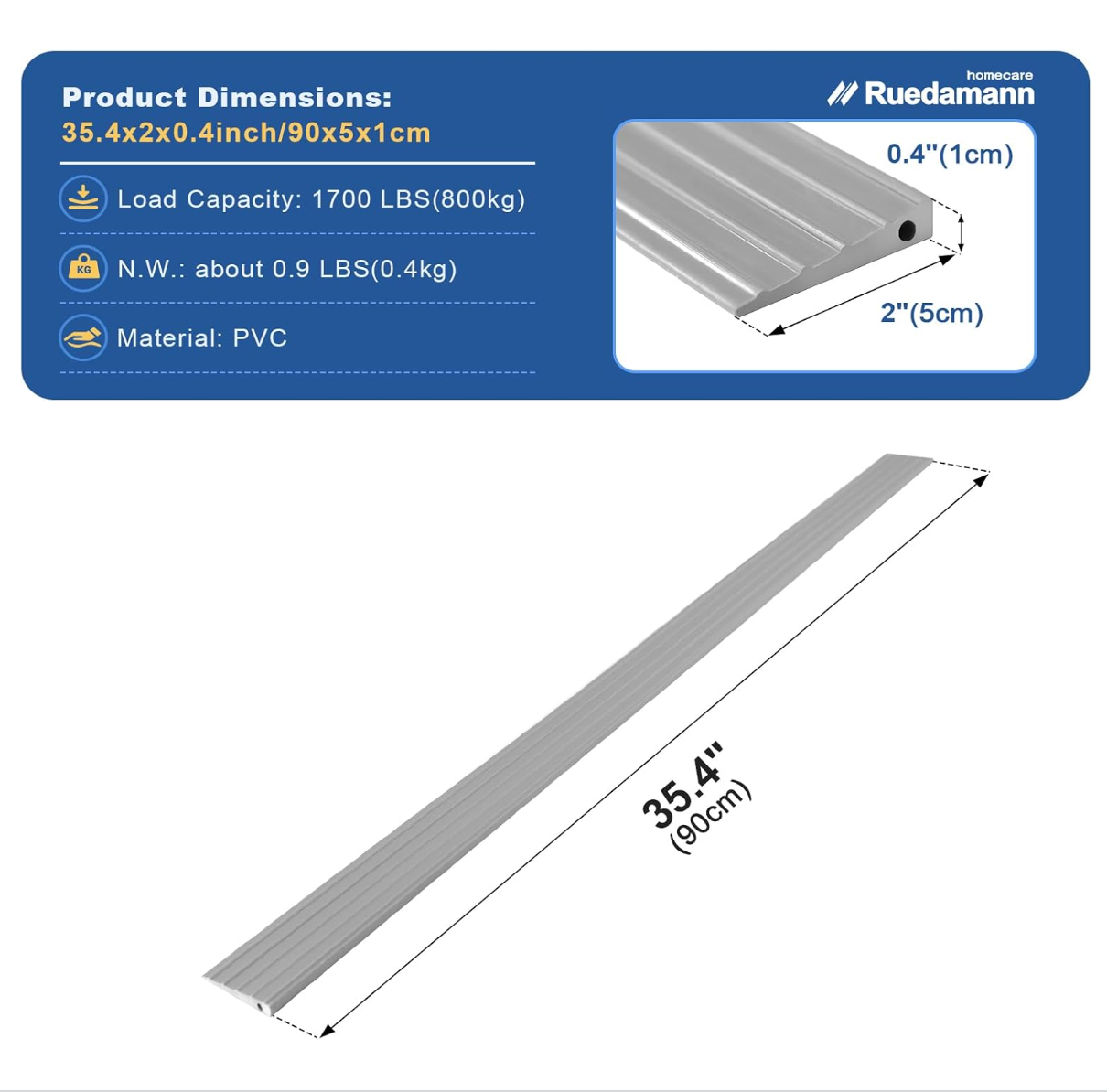 • 【Sturdy PVC Threshold Ramp】: Ruedamann Ramp measures 2"L x 36"W x 0.4"H;3"L x 36"W x 0.6"H;4"L x 36"W x 0.8"H;5"L x 36"W x 1"H. It can support up to 1700 lbs, ensuring robust performance and long-lasting durability. Ideal for heavy-duty needs, whether for home or commercial use, providing reliable and safe access for wheelchair, scooter, sweeping robot
