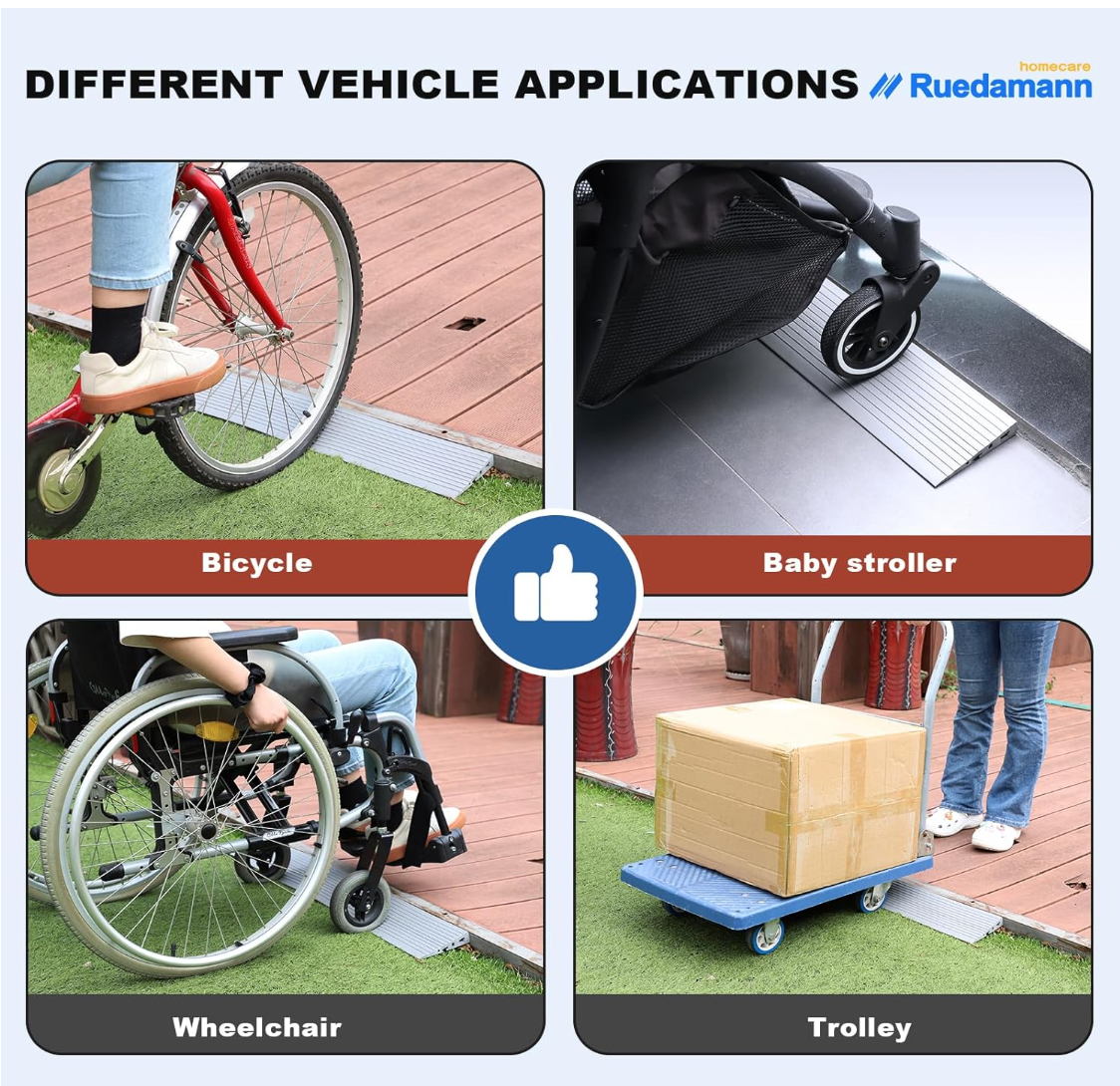 • 【Versatile Accessibility Ramp】: Ruedamann threshold ramp is ideal for wheelchairs, strollers, hand carts, bicycles, and more. It is versatile enough for home, garage, or business use, offering smooth and secure access, making it a practical solution for home steps, doorway, curb