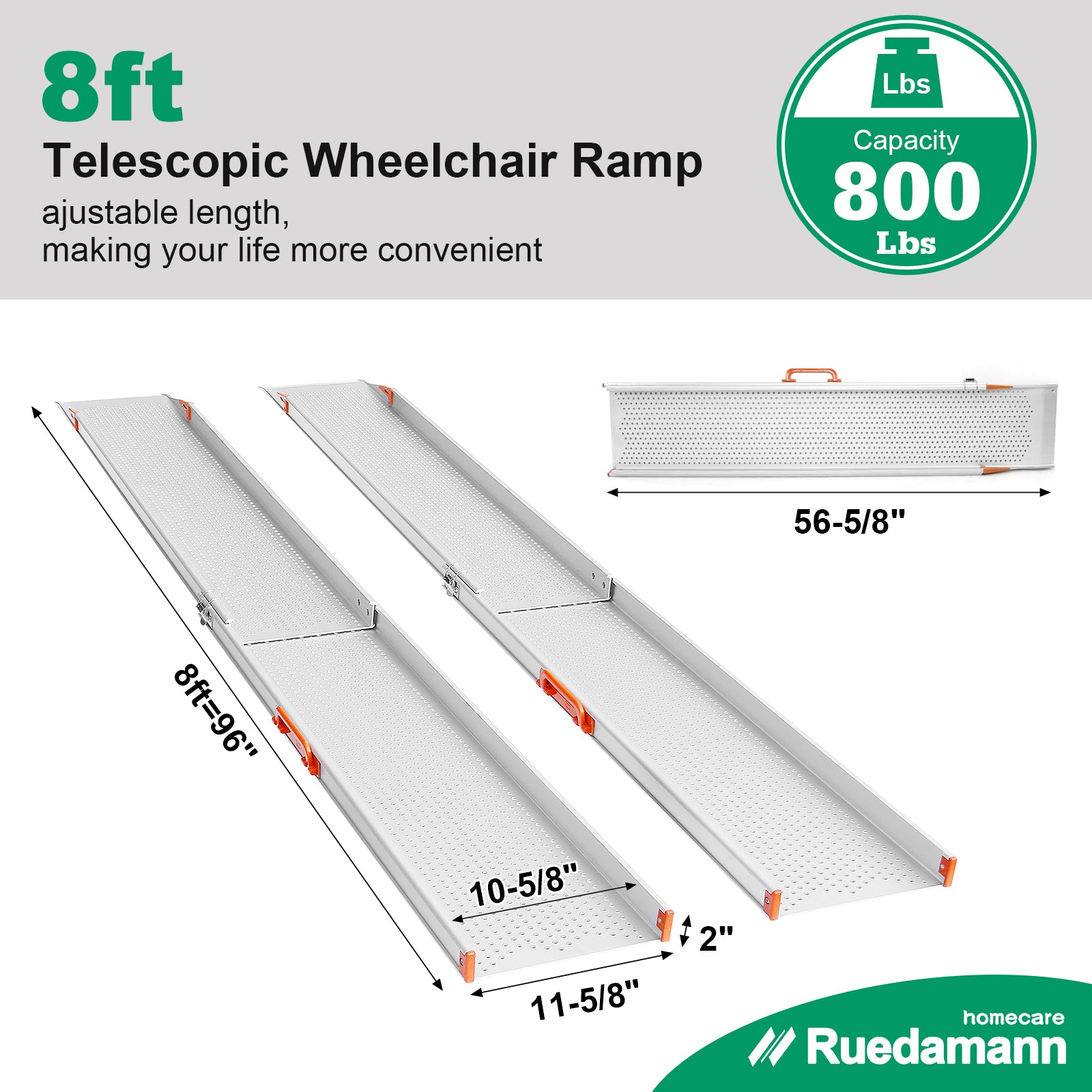 Our normal folding ramps are 72cm wide, and we also offer extra-wide folding ramps with a width of 85cm. Telescopic ramps require you to check whether the tire width of the wheelchair or scooter you are using exceeds the inner width of the telescopic ramp. The inner width of our telescopic ramps is in the range of 15-25cm.